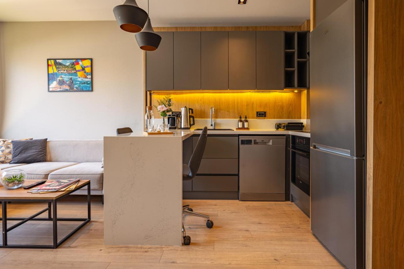 One-Bedroom Apartment. This apartment consists of 1 living room, 1 separate bedroom and 1 bathroom with a walk-in shower and free toiletries. Guests can make meals in the kitchen that is equipped with a stovetop, a refrigerator, a dishwasher and kitchenware. The air-conditioned apartment provides a flat-screen TV with streaming services, a washing machine, soundproof walls, a tea and coffee maker as well as garden views. The unit offers 1 bed. ;