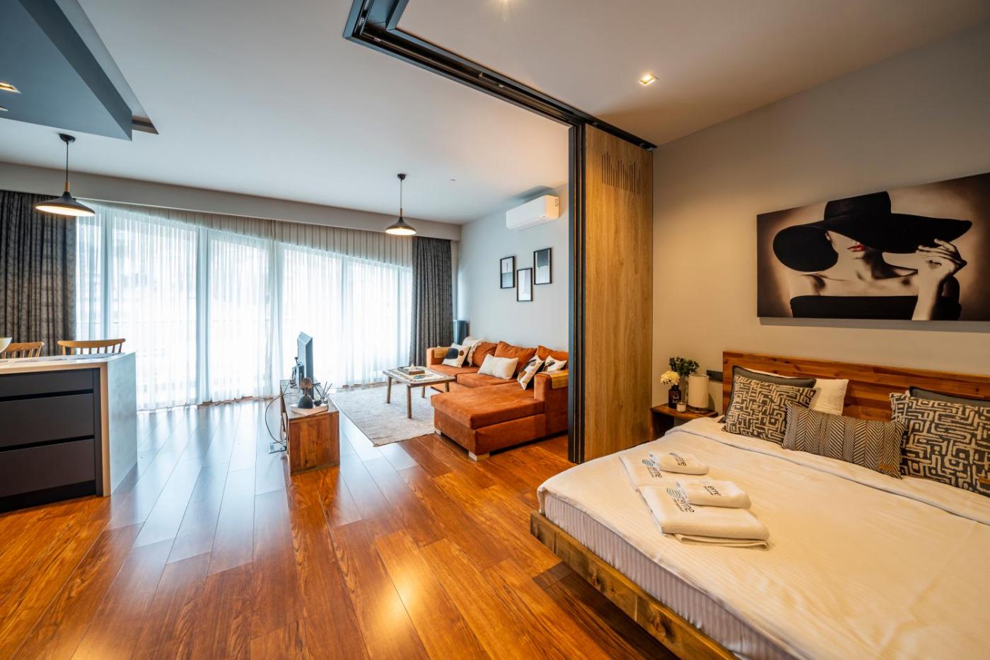 One-Bedroom Suite. This suite consists of 1 living room, 1 separate bedroom and 1 bathroom with a shower and free toiletries. In the well-equipped kitchen, guests will find a stovetop, a refrigerator, a dishwasher and kitchenware. This suite is air-conditioned and features a seating area with a flat-screen TV, a washing machine, a tea and coffee maker, a dining area, as well as a wardrobe. The unit offers 2 beds. ;